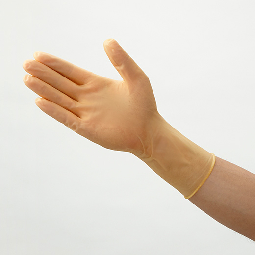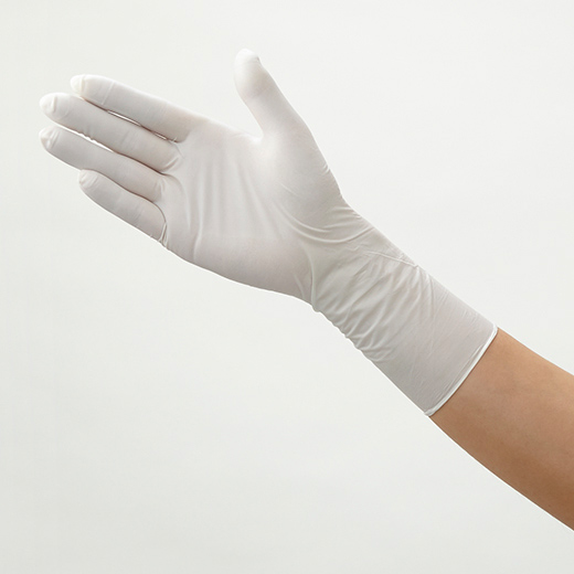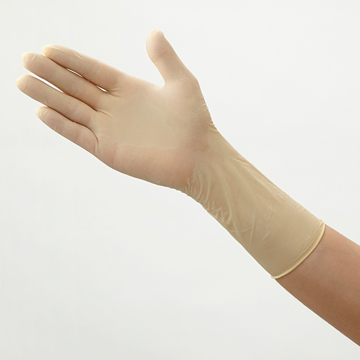 天然ゴムラテックス製手袋。手首まで覆えるロングタイプです。