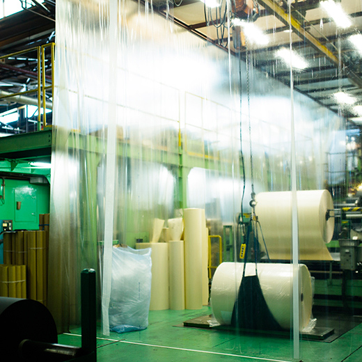 作業スペースの防塵対策のほか、空調効率の向上のために使用される間仕切り用のプラスチックフィルム。