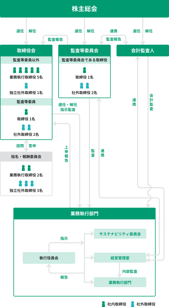 こうした理念を実現して、持続可能な企業であり続けるためには、お客様、お取引先、社員、株主、地域社会という様々なステークホルダーの信頼獲得が不可欠であり、柔軟かつ機動的な意思決定を図るとともに、コーポレートガバナンス(企業統治)を強化することが重要であると認識しています。