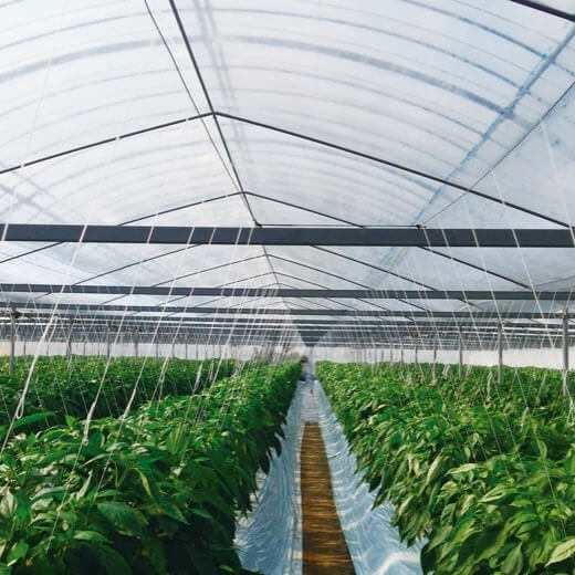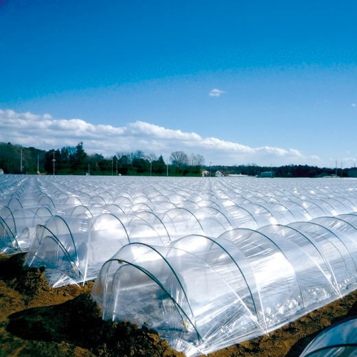 農ビは、ビニールハウスの外張り、内張りの展張作業を効率的に行える柔軟性に富んだポリ塩化ビニル樹脂の特性を活かしたフィルムです。ビニールハウスのほか、トンネル用途向けに保温性能を強化したフィルムも取り揃えています。