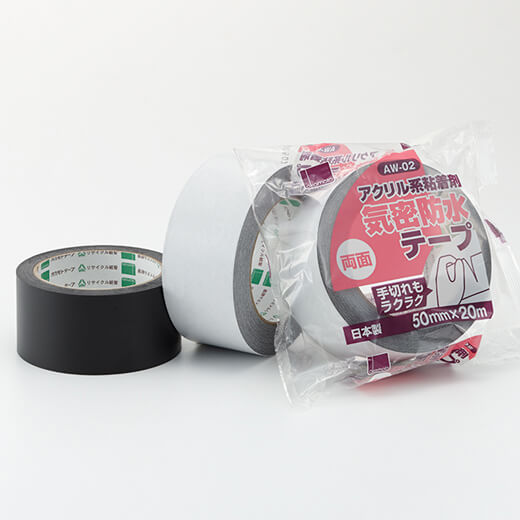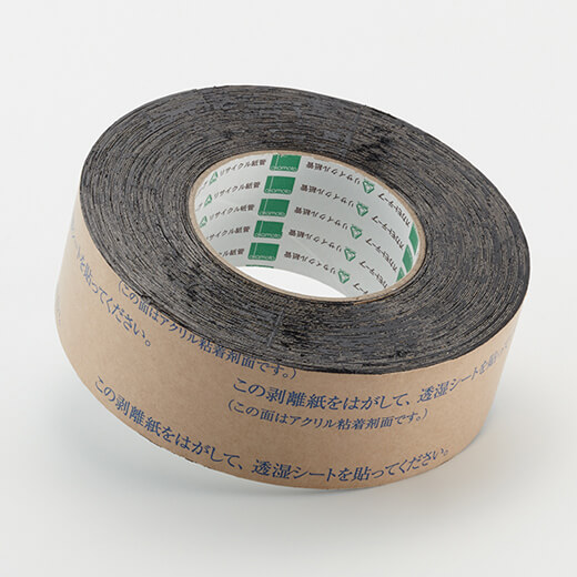 防水用のブチル系粘着剤面と透湿防水シートになじむアクリル系粘着剤面からなる両面テープです。