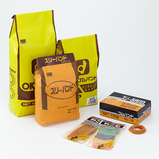 天然ゴム製のゴムバンド。500g入りと1kg入りの2種類。