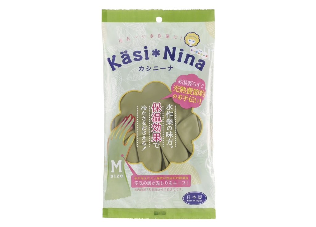 「カシニーナ コールドブロック」は、指先から手首まで独自の構造を持つ発泡層を採用し、保温効果を高めた炊事用手袋です。手のひら部には、食器が滑りにくいとご好評をいただいている ドット加工を採用し、皿洗い時でも食器が滑り落ちにくく、安心 してお使いいただけます。 指部分は人間工学に基づいた「指先カーブ設計」を採用している ので、軽くて、しなやかな使い心地を実現しました。