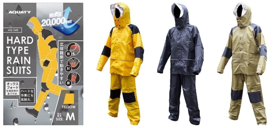 「ハードタイプレインスーツ AQ-340」は、耐水圧20,000mm以上の生地により強い雨でも浸水しづらく、負荷のかかる箇所にはオックスフォード生地の二重構造で補強しましたので、膝をつく作業などさまざまなシチュエーションに適した商品です。