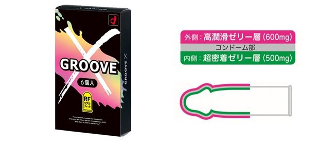 2022年3月に発売を開始した「GROOVE(グルーヴ)」は、オカモト史上初の高潤滑ゼリーと超密着ゼリーという2種類の異なる潤滑ゼリーを採用したコンドームで、今までにない“なめらかな使い心地”に仕上げた商品です。
