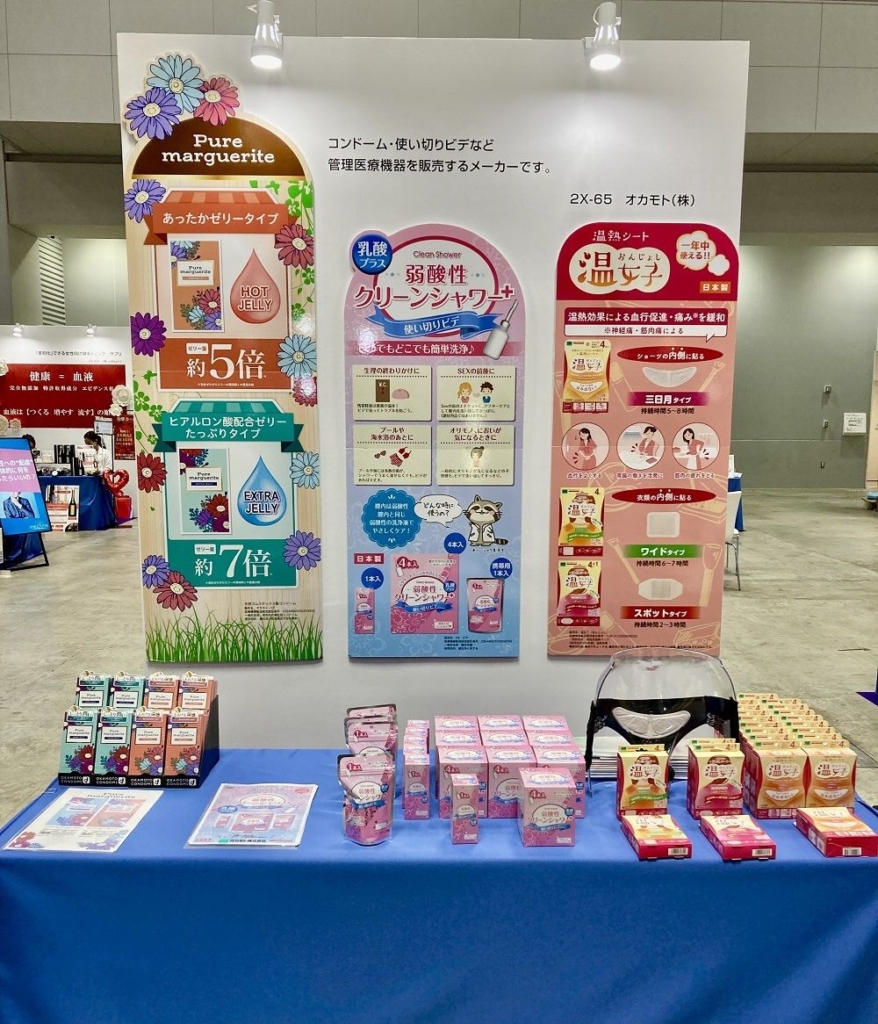 展示では、潤滑ゼリーたっぷりタイプで手に取りやすいデザインの女性にやさしいコンドーム「ピュアマーガレット」や、使い切りビデの「弱酸性クリーンシャワープラス」、温熱シート「温女子」をご紹介させていただきました。お話をさせていただく中で、フェムテック・フェムケア領域の注目度を改めて実感いたしました。