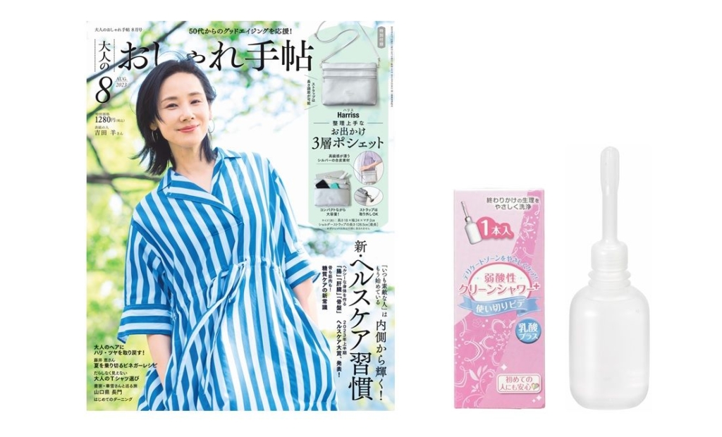 株式会社宝島社より発行されている雑誌『大人のおしゃれ手帖』145号(7月7日発売)の2023年上半期ヘルスケア大賞特集のフェムテック部門にて”膣内と同じ弱酸性の乳酸入り洗浄液で、やさしくケアできる”として、「弱酸性クリーンシャワープラス 1本入」が紹介されました。