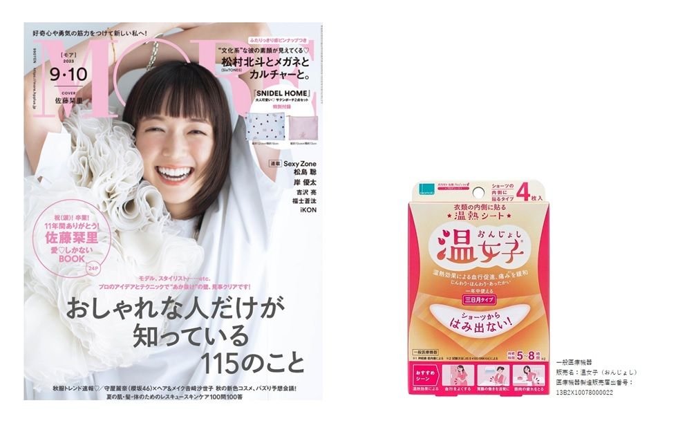 株式会社集英社より発行されている雑誌『MORE』2023年9・10月合併号(7月28日発売)の夏の肌・髪・体のための特集にて”骨盤周りを温めて血色感がアップする”と「温女子」が紹介されました。