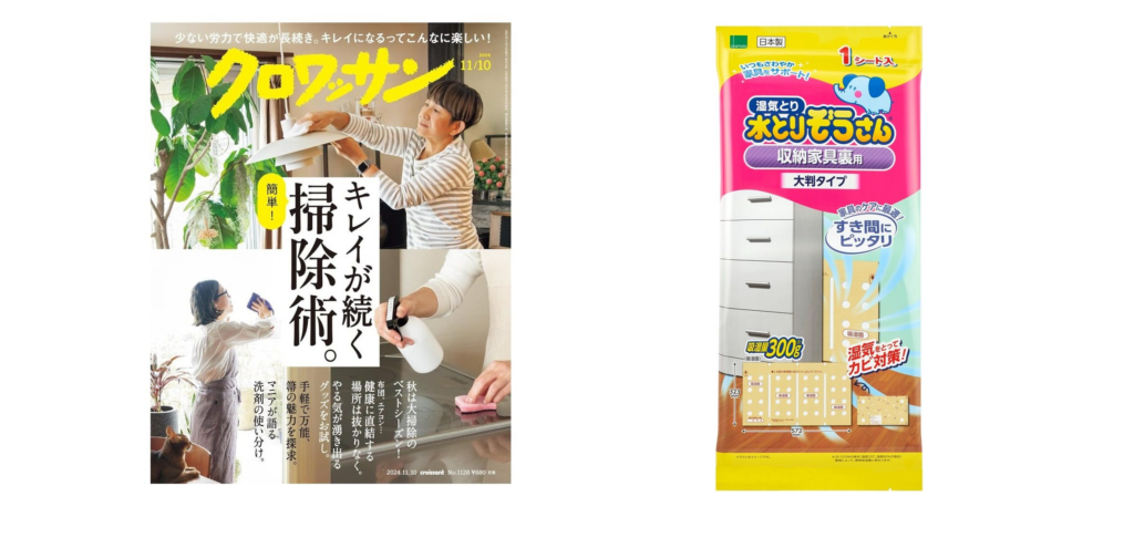 株式会社マガジンハウスより発行されている雑誌『クロワッサン』2024年10月25日号(11月10日発売)の「キレイが続く簡単!掃除術。」特集にて”大物家具と壁の間もうまく除湿すれば、カビは怖くない”と「水とりぞうさん®収納家具裏用(大判タイプ)」が紹介されました。