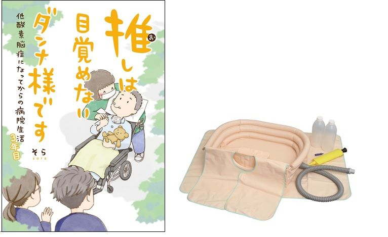 株式会社幻冬舎コミックスより2024年2月29日(木)発売の『推しは目覚めないダンナ様です 低酸素脳症になってからの病院生活3年目』内にて著者のそらさんが入院中の“ダンナ様”の洗髪をするために「洗髪器(サッパリさん)」をご利用いただく様子が描かれております。